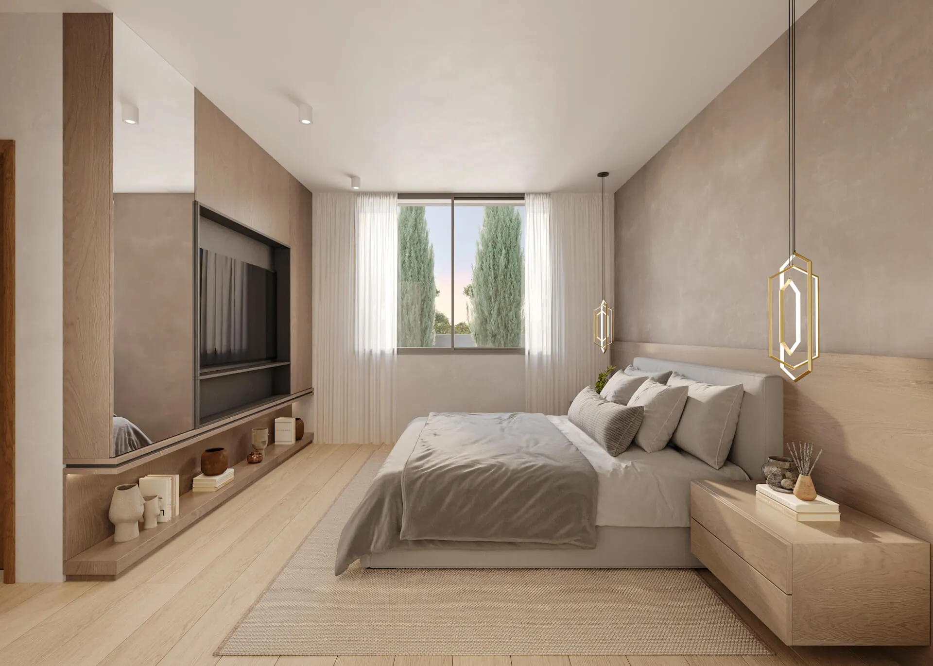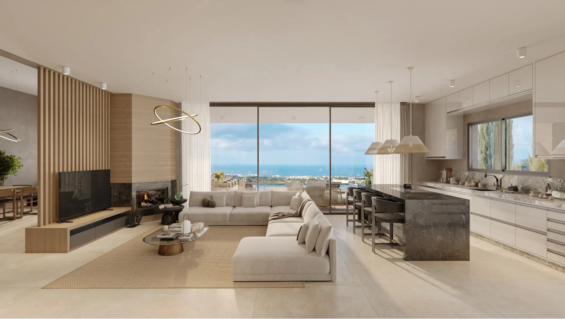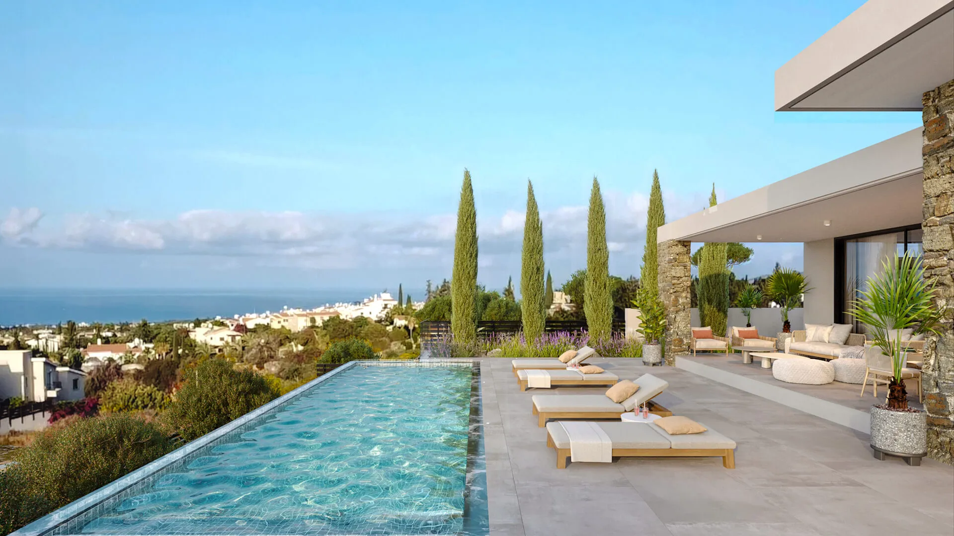 The interior is flooded with natural light through expansive glazing, creating a seamless connection between the modern living spaces and the horizon. A striking infinity pool serves as the project's centerpiece, visually merging with the Mediterranean Sea to offer a sense of endless tranquility. Every structural element has been carefully considered to enhance the dwelling's visual appeal, resulting in a captivating sanctuary that balances bold architectural statements with the serene beauty of the hillside.