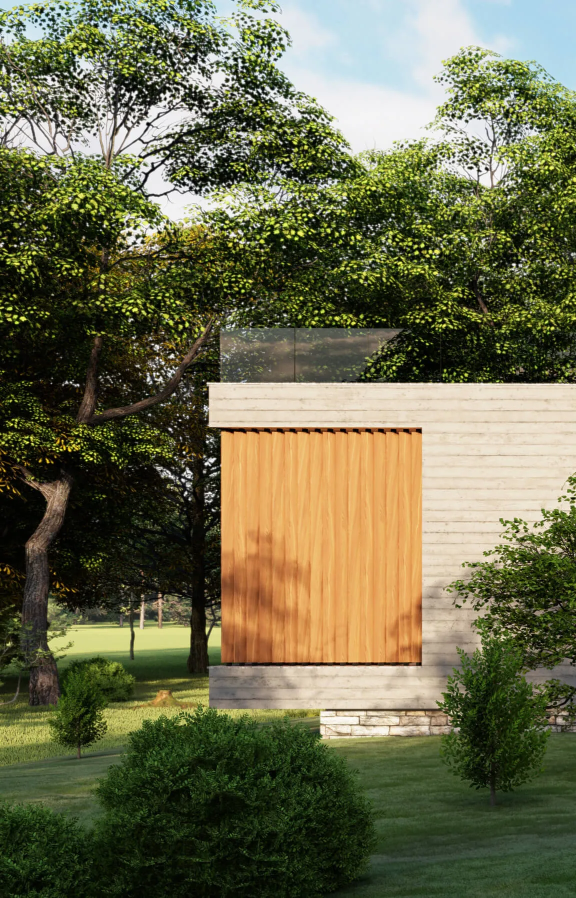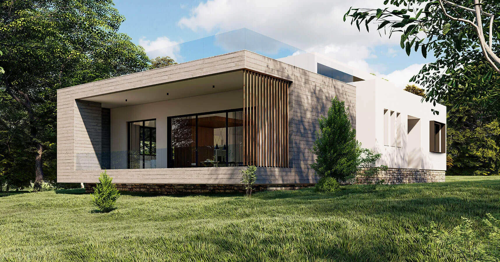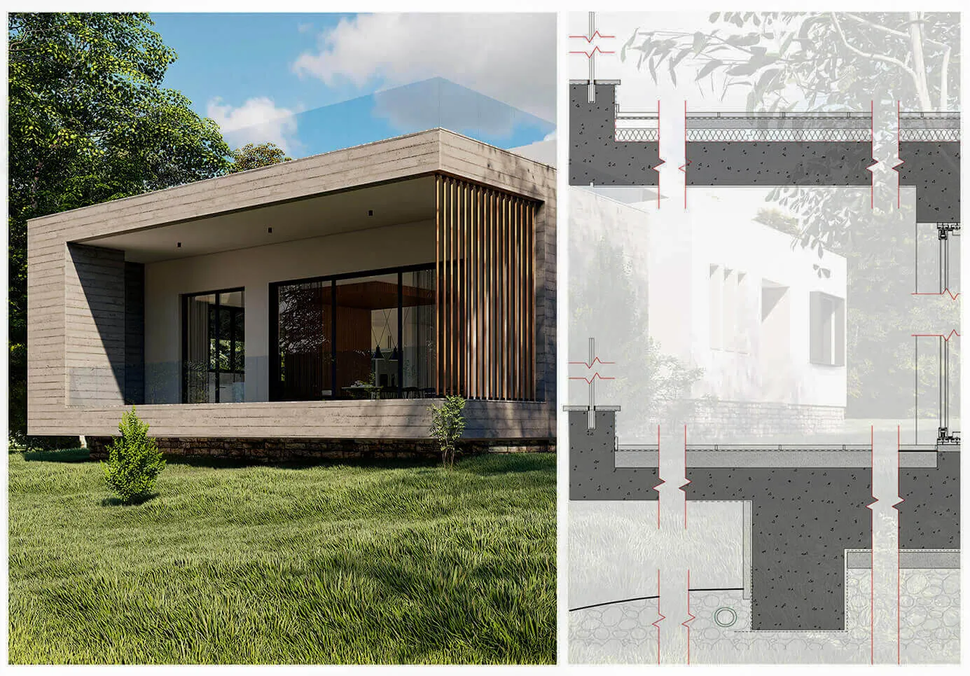 The lower volume, crafted from board-form concrete, houses the communal living areas and is positioned 60cm below the rest of the floor plan to subtly distinguish these social spaces. In contrast, the upper white volume contains the private bedrooms and utility zones. A grounding stone wall physically connects the structure to the earth, enhancing its integration with the landscape. This deliberate use of materials and levels ensures that the building’s form is a direct reflection of its function, creating a home that is both structurally honest and harmoniously balanced.