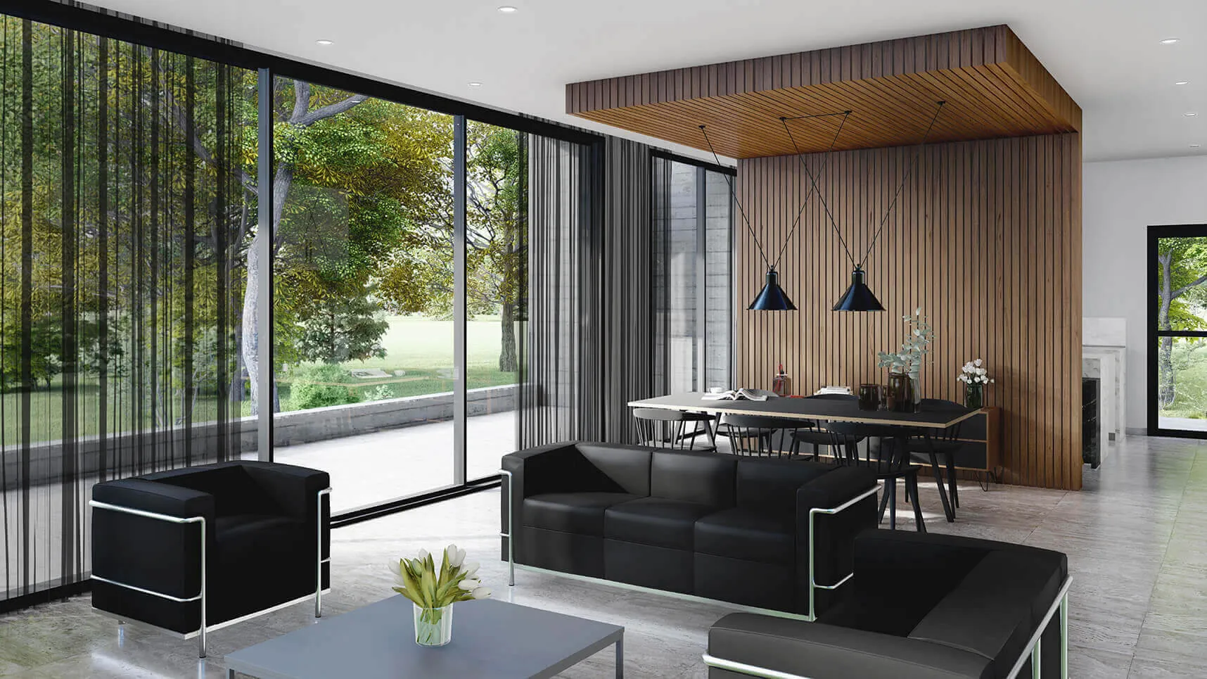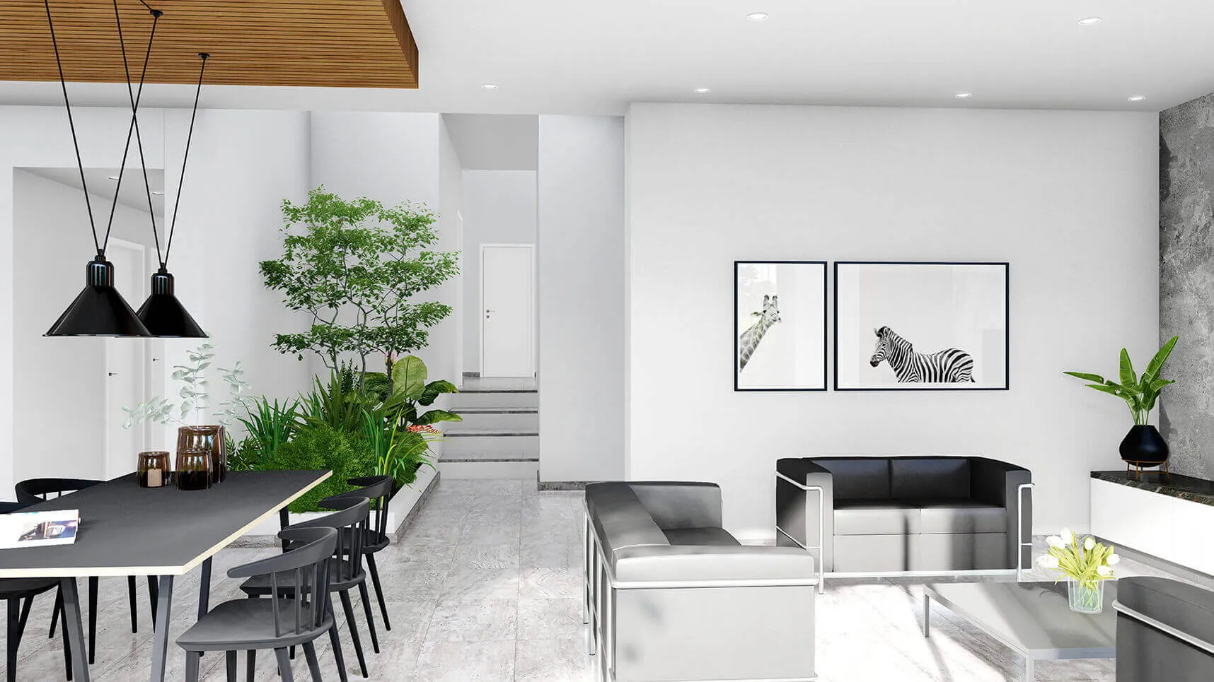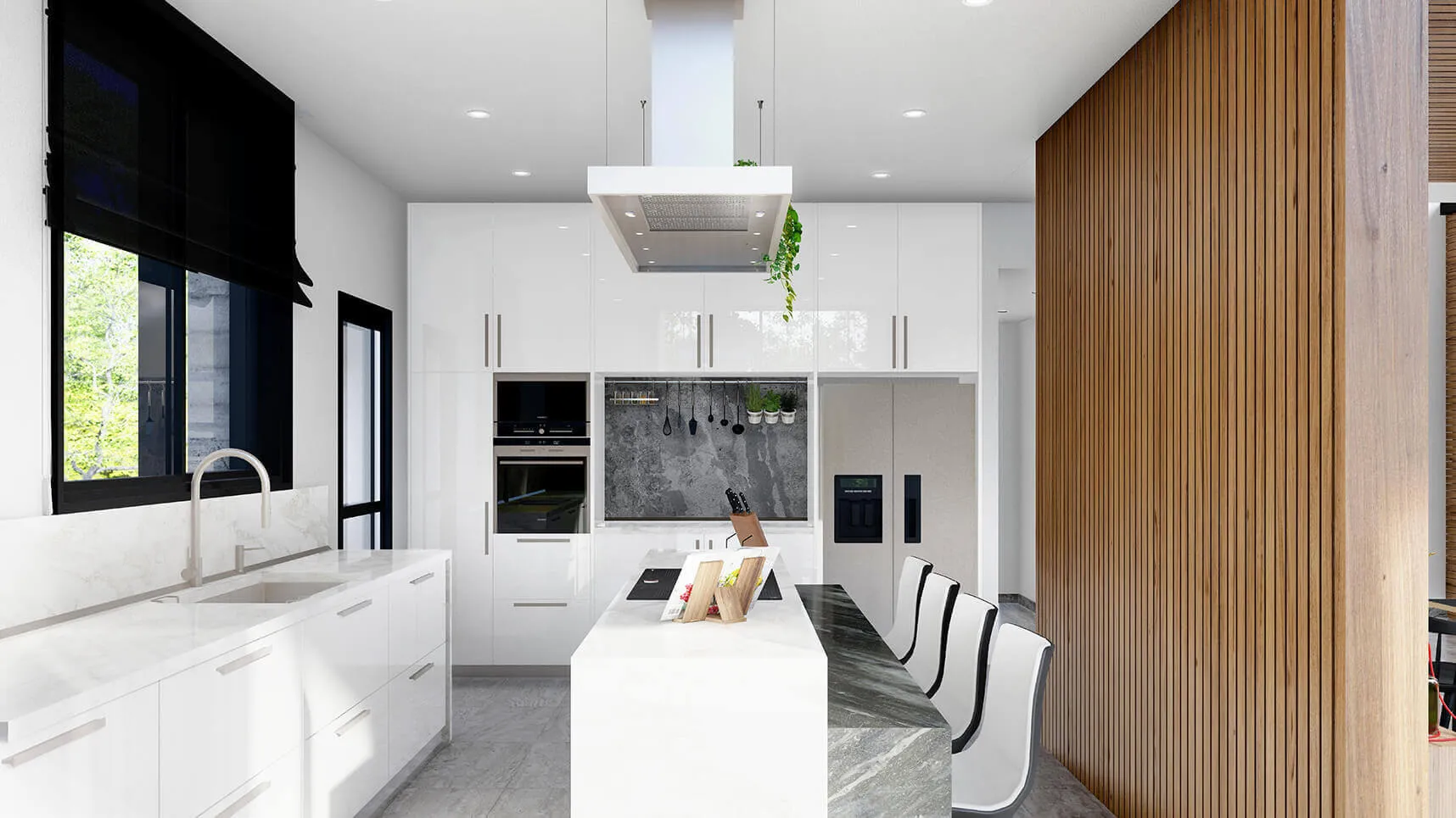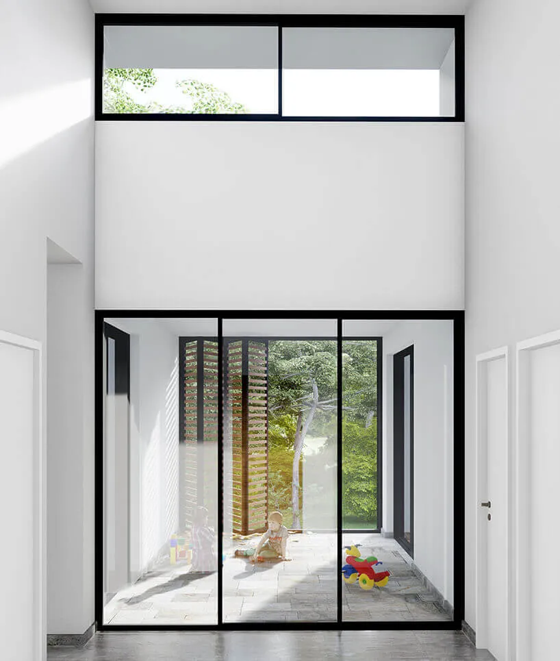 This split-level residence utilizes architectural form and materiality to define the boundary between social and private life. Two distinct volumes—a textured concrete base and a crisp white upper level—visually articulate the home’s internal logic.