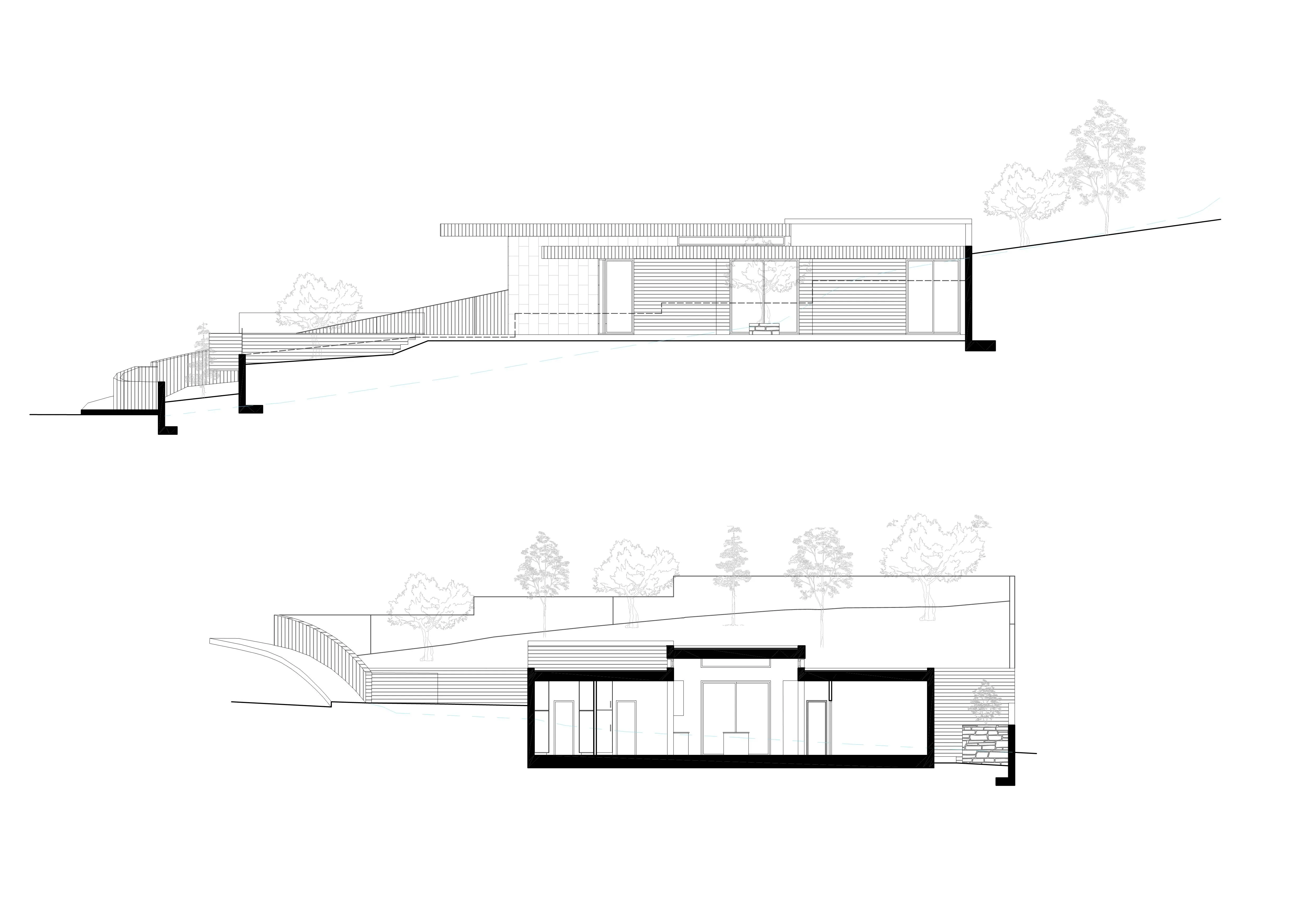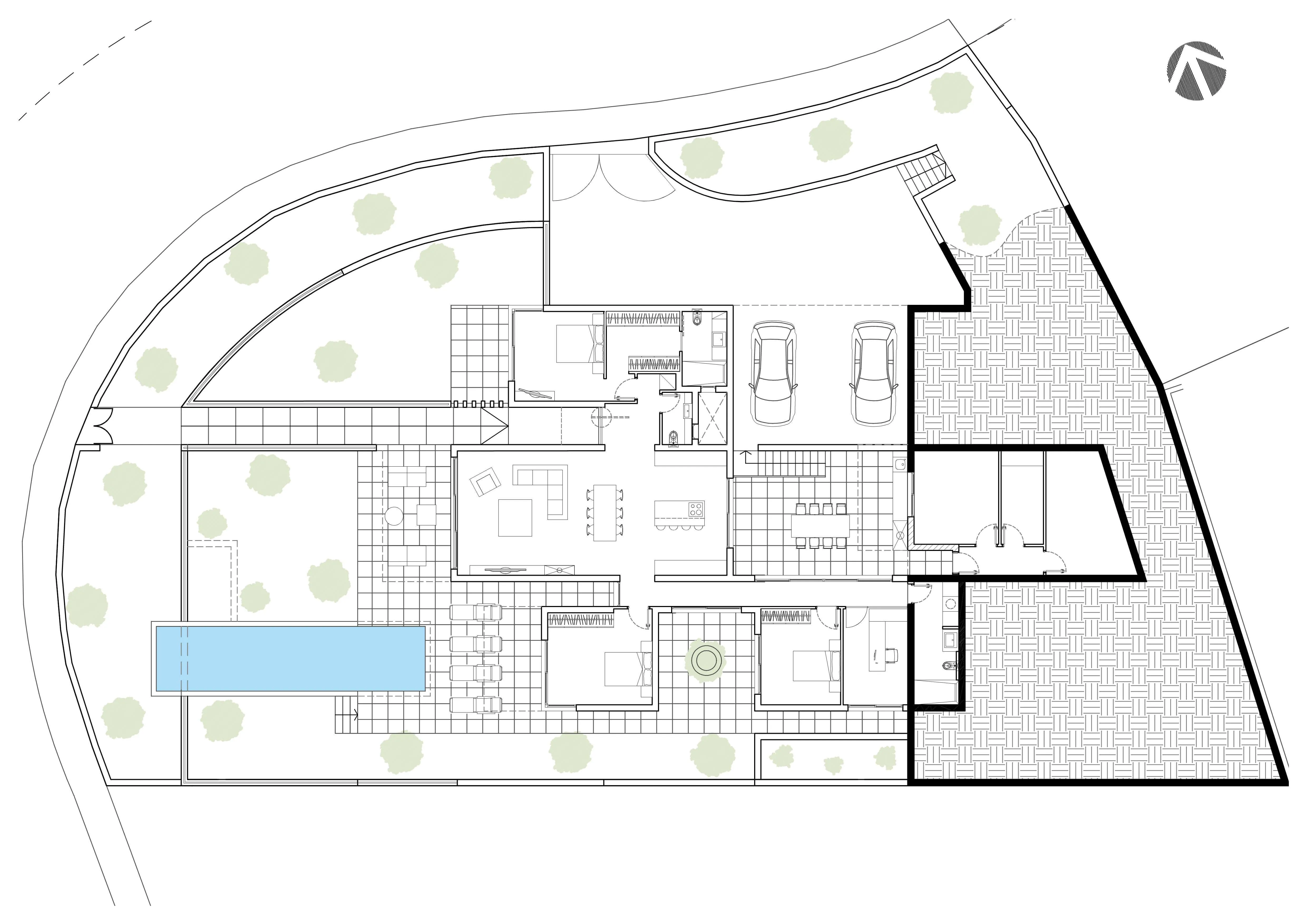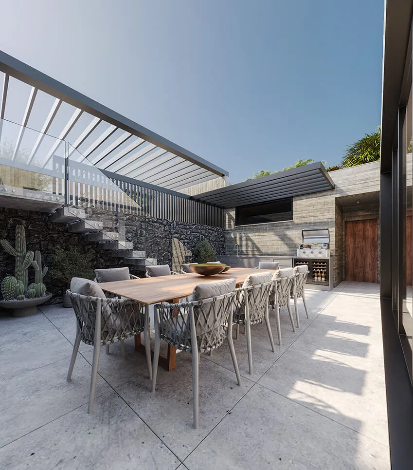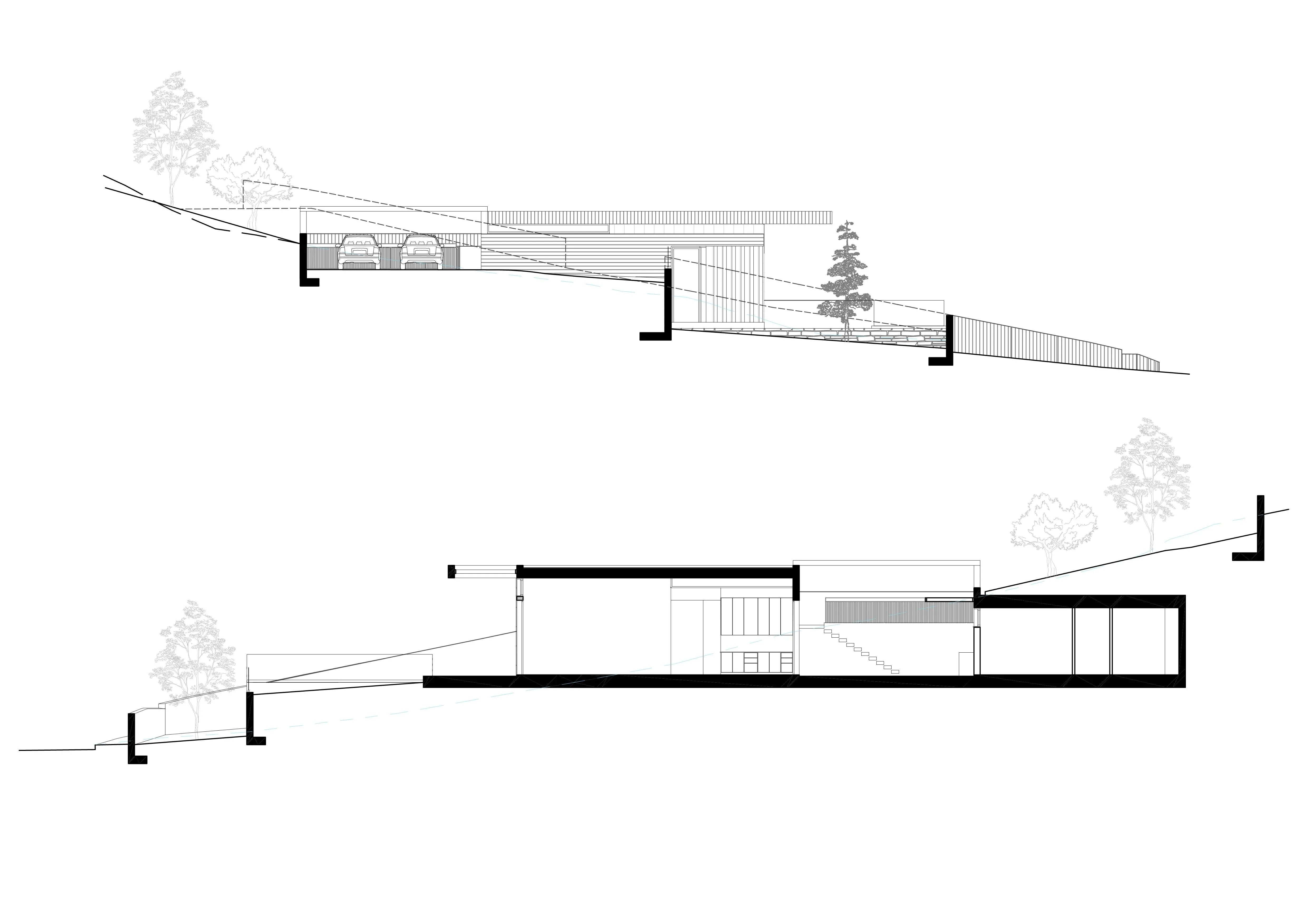 The interior's open-plan design amplifies space and light, meticulously zoned to balance shared areas with private retreats. Expansive glass doors dissolve the boundaries between the living spaces and a tranquil outdoor oasis, which features a secluded pool, dining courtyard, and lush greenery. By blending high-end luxury with the serenity of the sloping landscape, the home serves as a modern sanctuary that remains deeply connected to the terrain through its structural honesty and seamless indoor-outdoor flow.