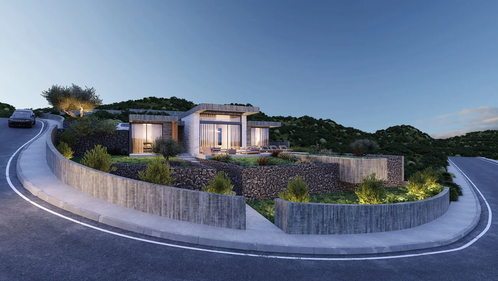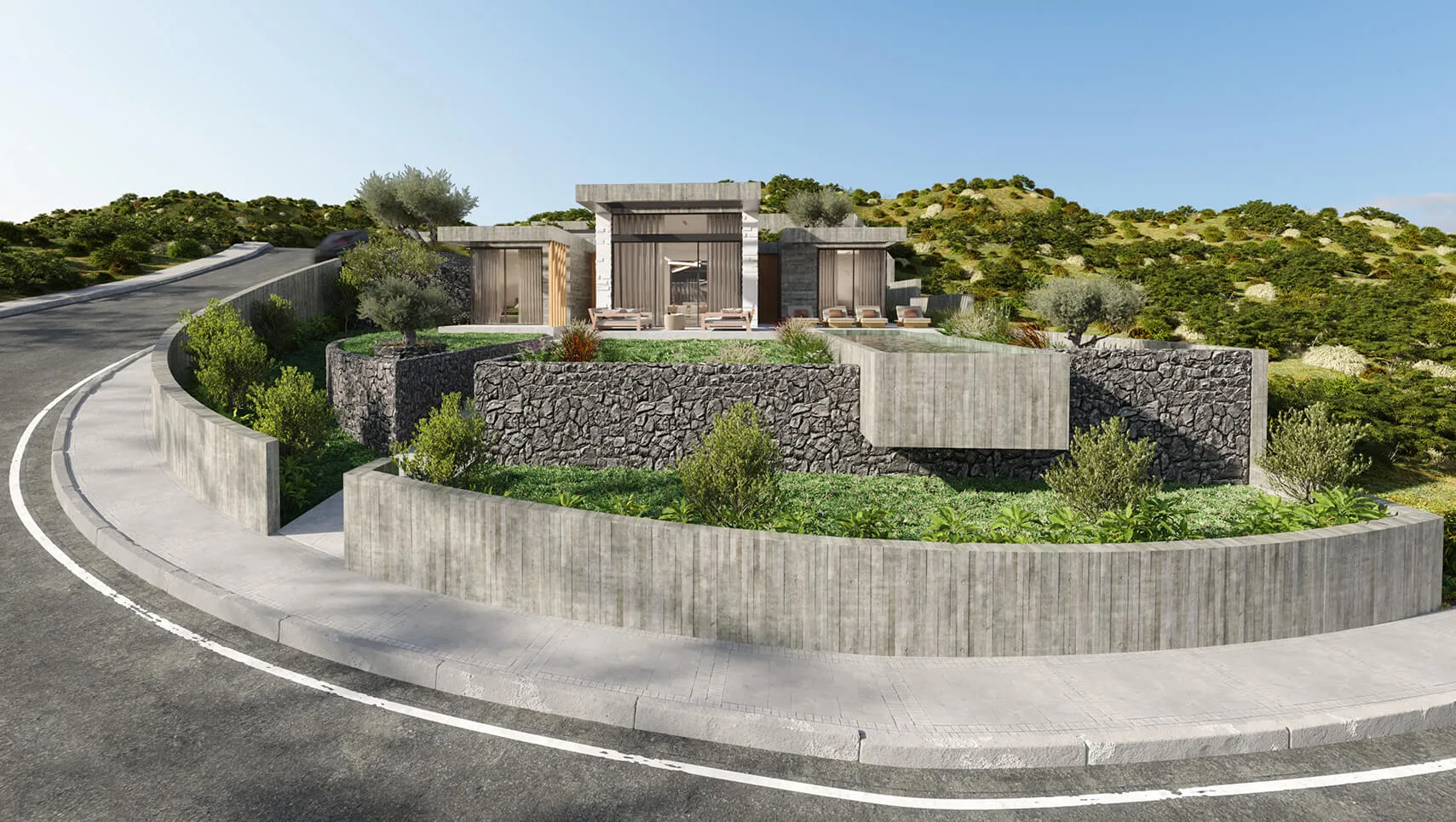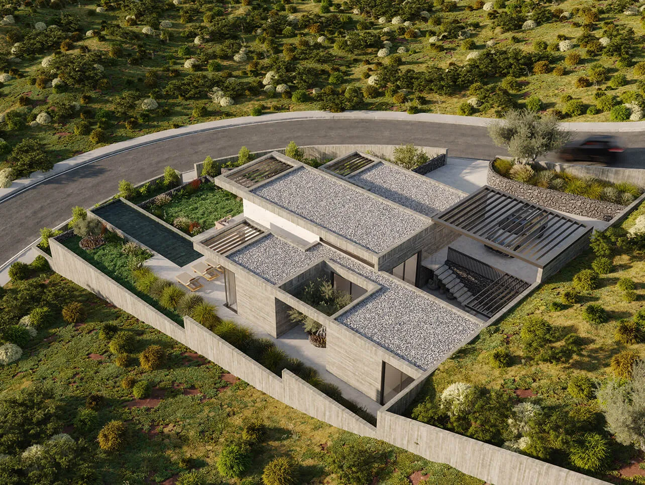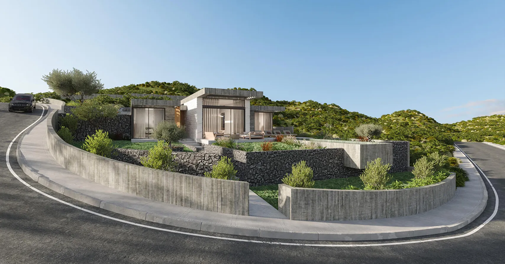 Expertly balancing contemporary architecture with its natural environment, this hillside residence uses an innovative layout to ensure privacy while capturing expansive views. Its stone and concrete façade reflects a clean, minimalist aesthetic.