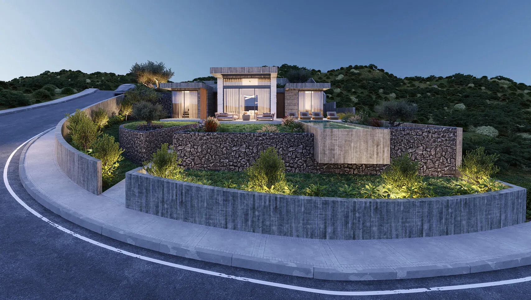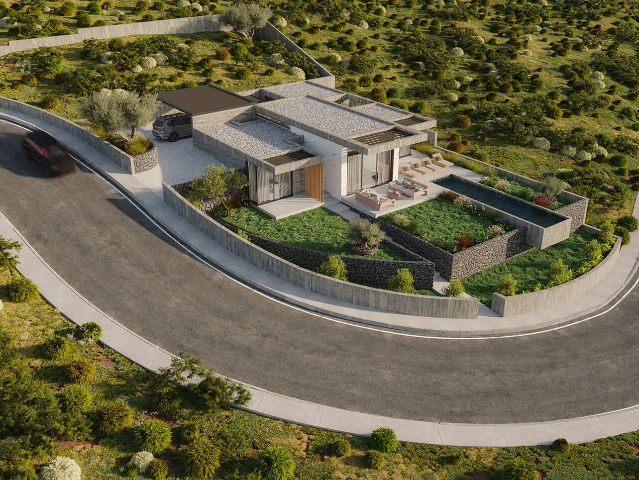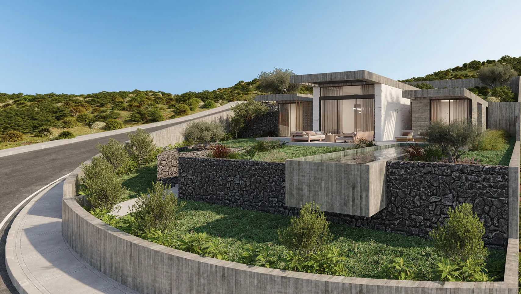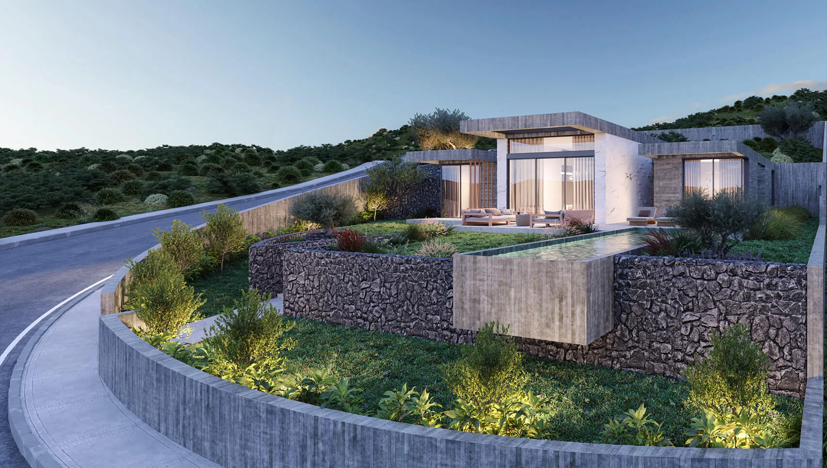 Expertly balancing contemporary architecture with its natural environment, this hillside residence uses an innovative layout to ensure privacy while capturing expansive views. Its stone and concrete façade reflects a clean, minimalist aesthetic.