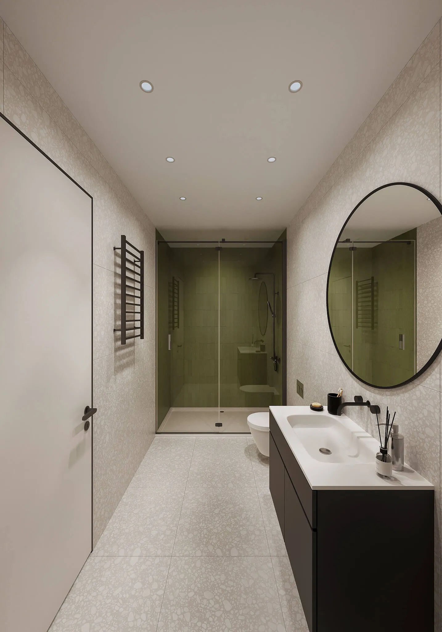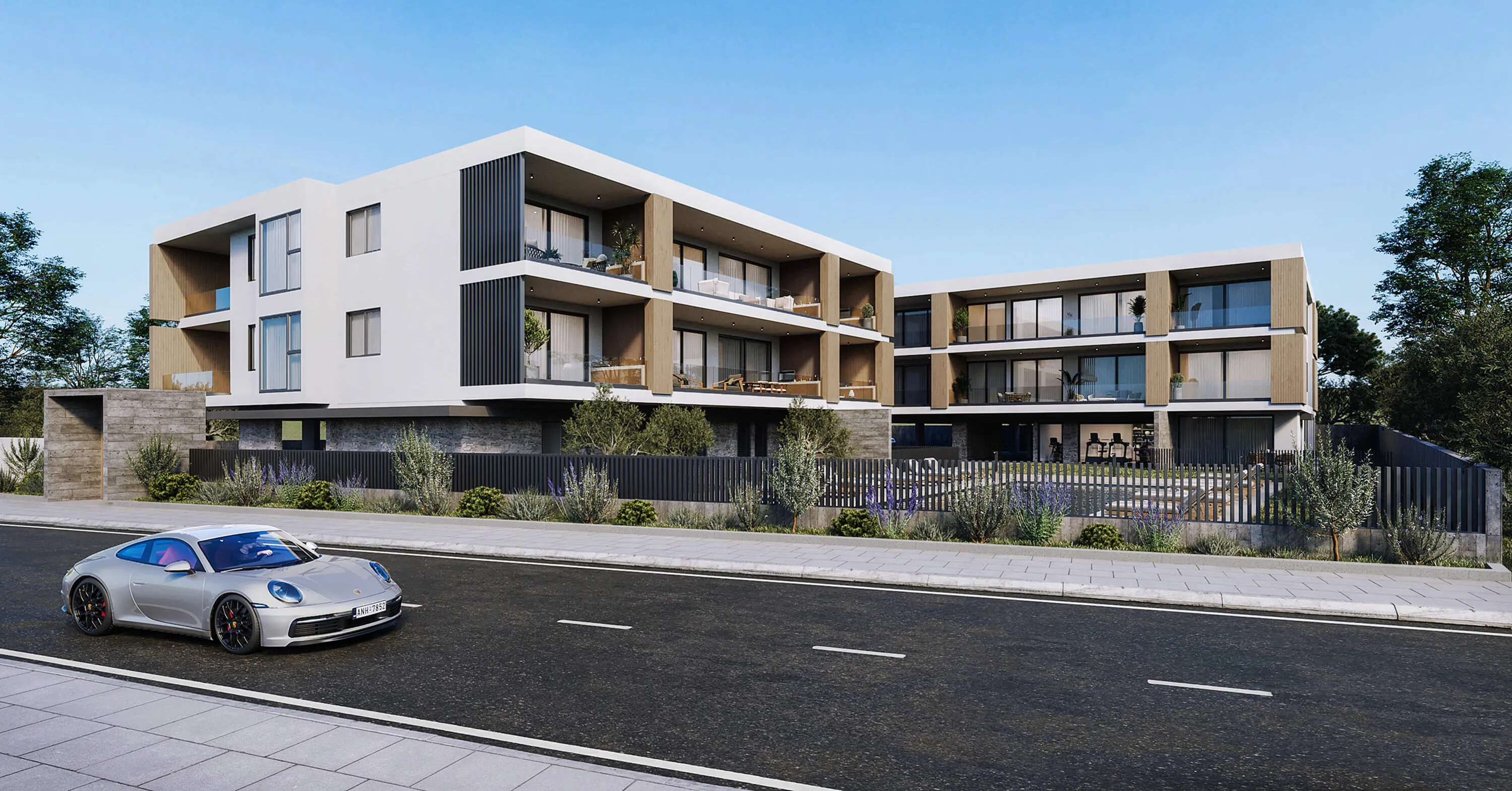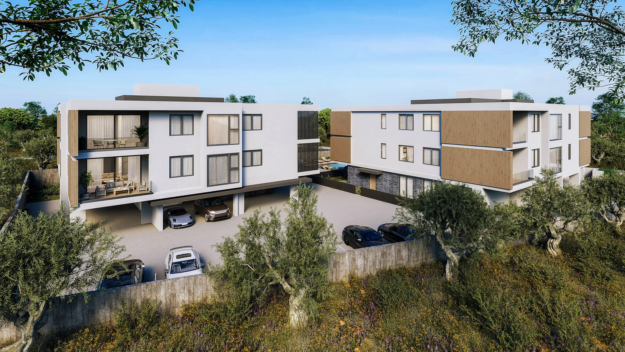 The material palette—a blend of concrete, stone, and warm wood-like cladding—grounds the structures within their natural setting. Inside, open-plan layouts prioritize space and light, using large glass doors to seamlessly connect living areas with covered outdoor terraces. For added luxury, two ground-floor three-bedroom units feature private gardens that serve as personal retreats. Shared amenities, including a pool and gym, are integrated into the landscaped grounds as a central hub, offering a quiet environment for relaxation and social interaction.